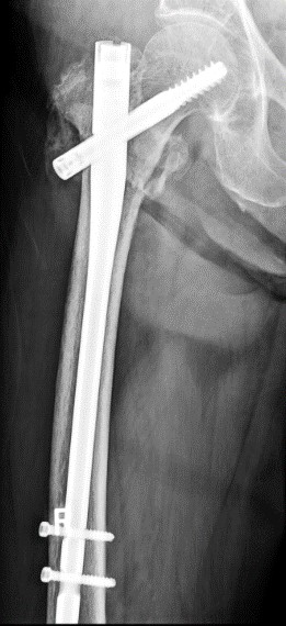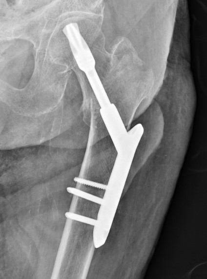 大腿骨転子部骨折は骨癒合しやすい骨折のため骨折部をできるだけもとの形状に近づけ、金属の器具で固定するという骨接合術が一般的に行われます。ラグスクリューという太いネジを大腿骨の外側部分から骨頭内に入れます。これを大腿骨の外側に当てたプレート(板)や大腿骨内に差し込んだ太いネイル(棒)などで支えて固定をするという方法です。プレートやネイル以外にも固定する場合もあります。