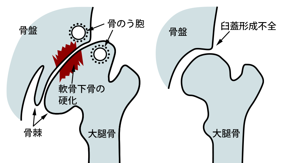 軟骨自体はレントゲンには写りませんが、臼蓋と骨頭の隙間ですり減り具合を判断できます。また関節の中や周囲に骨棘と呼ばれる異常な骨形成や骨嚢胞と呼ばれる骨の空洞の有無などから進行具合も分かります。