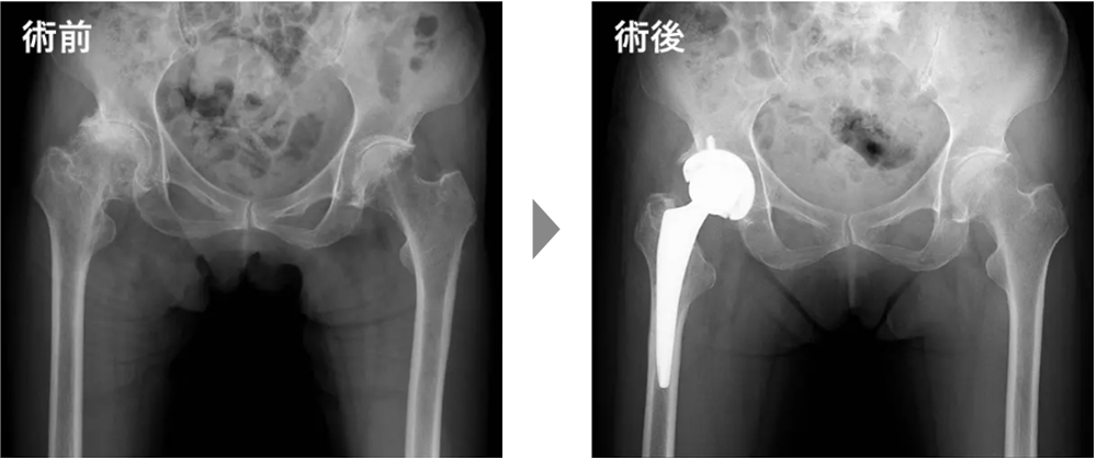 手術の多くは傷んだ骨の一部を取り除き、人工の関節に置き換える人工関節置換術という方法で行います。