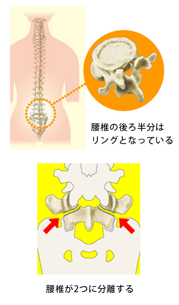 多くは骨が未発達な成長期の小学生高学年~高校生(特に中学生頃)に腰をそらしたり回したりジャンプを繰り返すことにより、腰椎の後方部分に亀裂が入って起こります。 野球、サッカー、バレーボール、ラグビー、柔道などの過度な練習が原因となるケースが多いとされています。