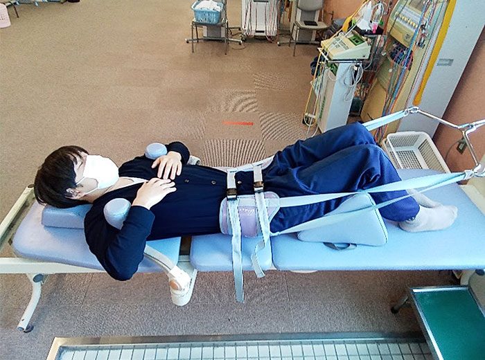 腰に間欠牽引(短時間の牽引と休止を繰り返す方法)を行うことで、椎間板や椎間関節の内圧を下げたり、椎間の隙間(椎間孔)を拡げることで神経への圧迫を和らげていく治療です。体重の1/3~1/2ほどの負荷で足の方へ10分間行っていきます。