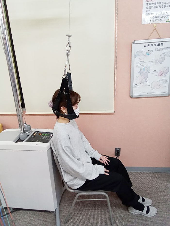 頸部に間欠牽引(短時間の牽引と休止を繰り返す方法)を行うことにより、椎間板や椎間関節の内圧を下げたり、椎間の隙間(椎間孔)を拡げることで神経への圧迫を和らげていく治療です。