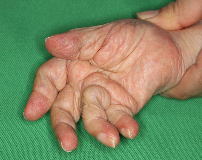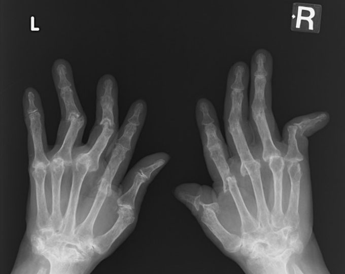 関節リウマチとは全身の関節の炎症が続いて、徐々に関節の破壊や変形が起こり機能障害を起こす病気です。近年良く効く薬が開発されて、痛みや炎症を抑え関節破壊の進行を止めることができるまでになりました。さらに寛解(完全に病気が治ってはいないが病気の活動性が完全に抑えられている状態)の達成や、さらに薬を服用しなくても寛解が維持できる状態の可能性の研究が進んでいます。