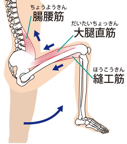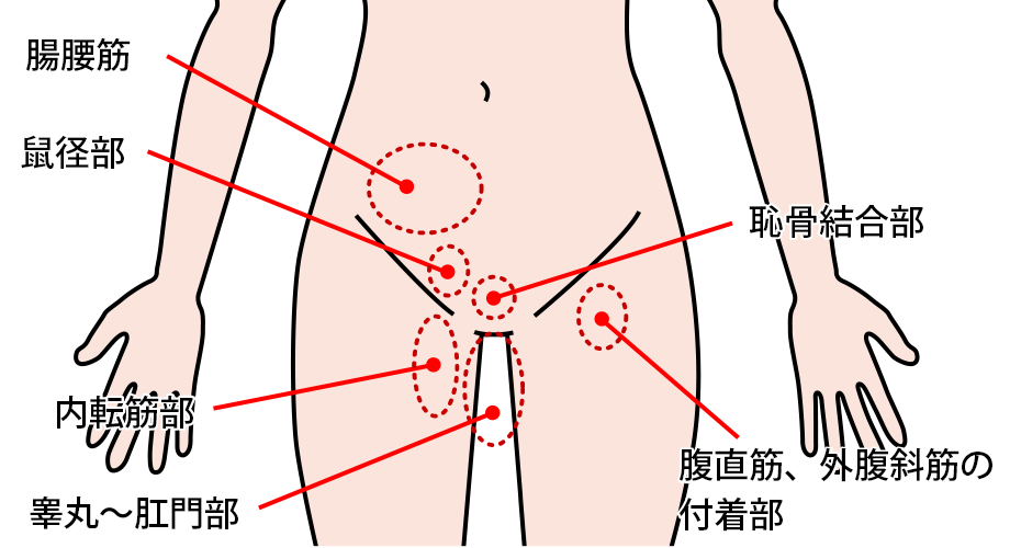 主に、股関節を曲げる動作や股関節を内に閉じる動作の際に使用する筋肉(腸腰筋や大腿直筋や内転筋など)に炎症を起こし痛みを訴えます。